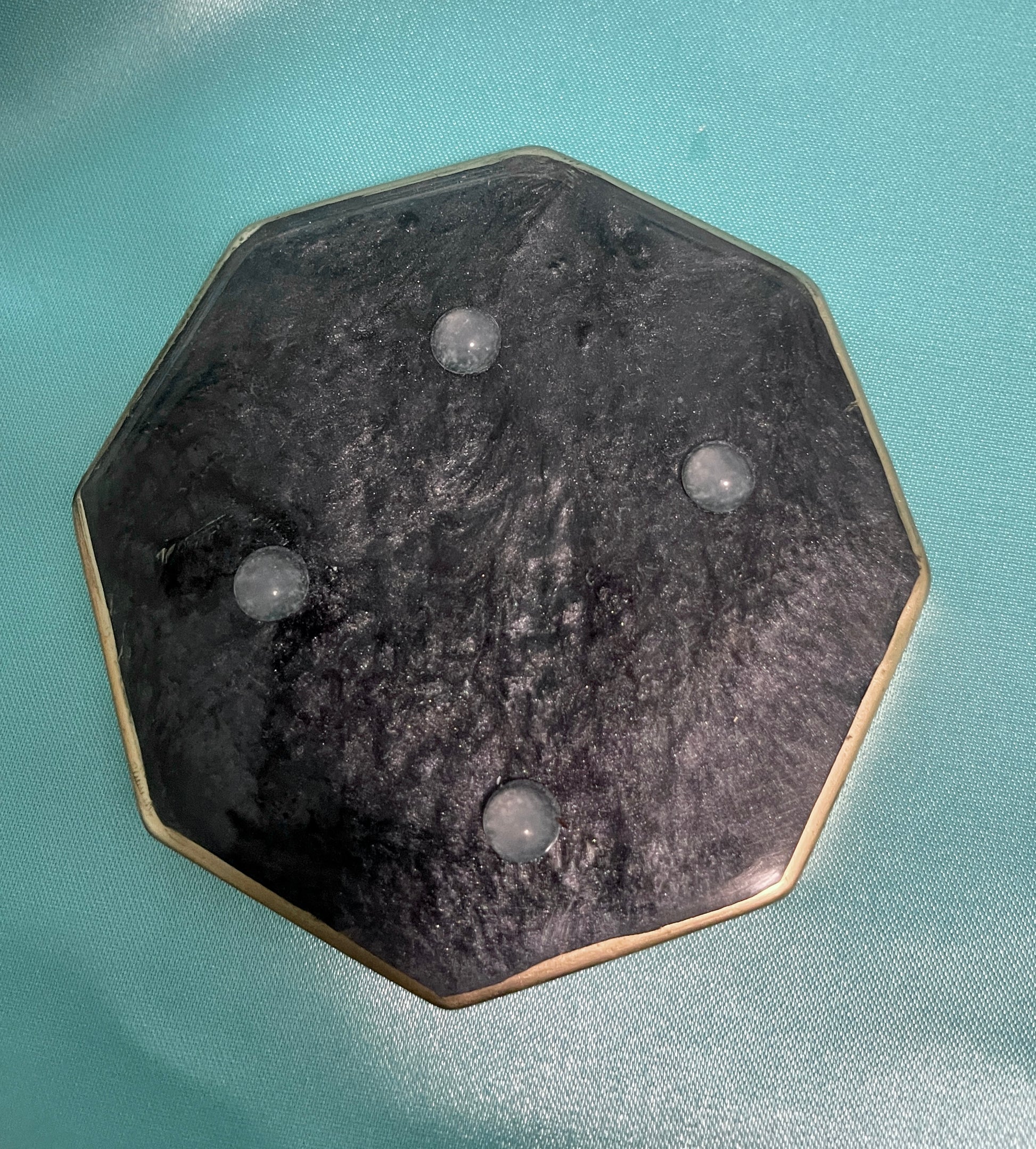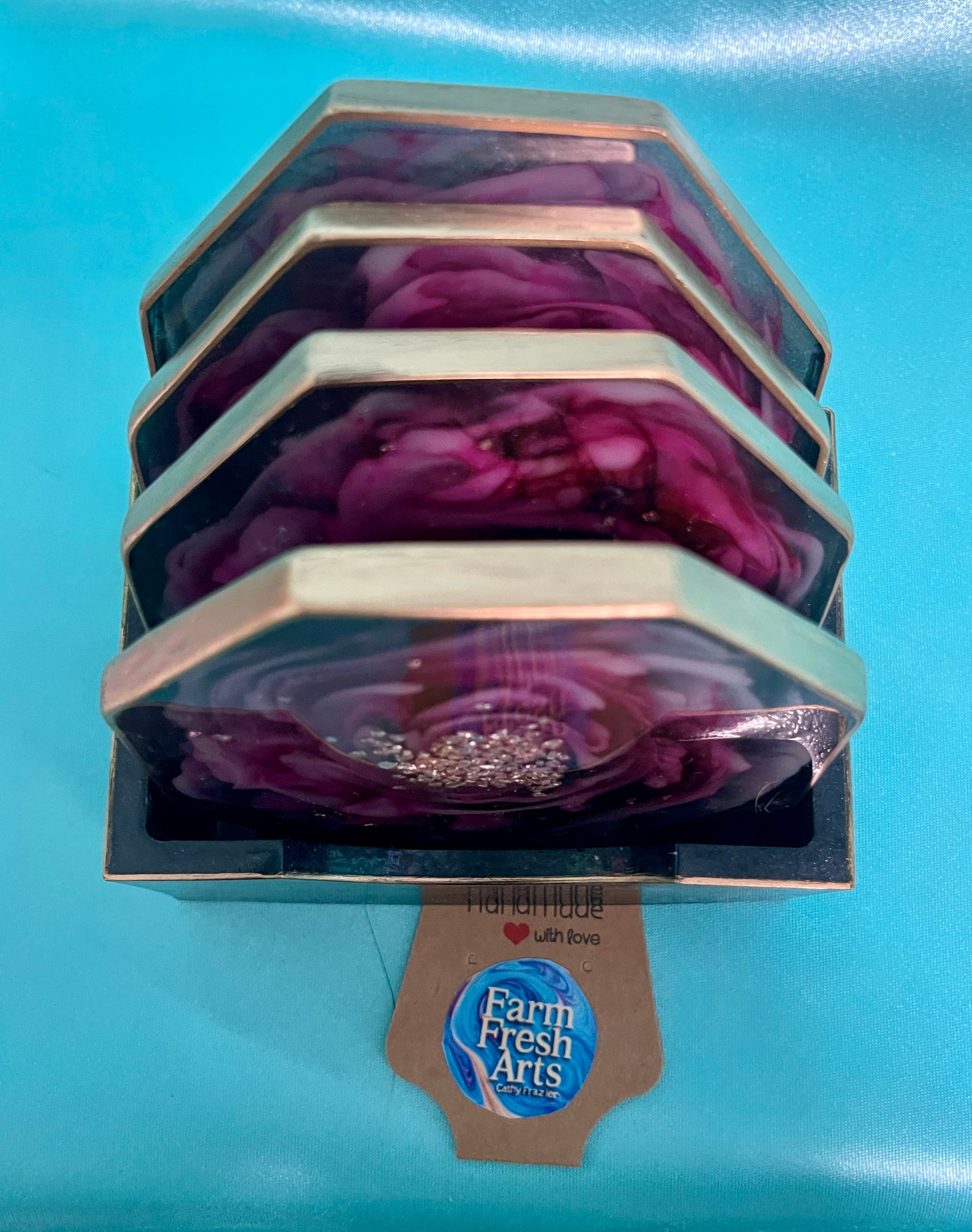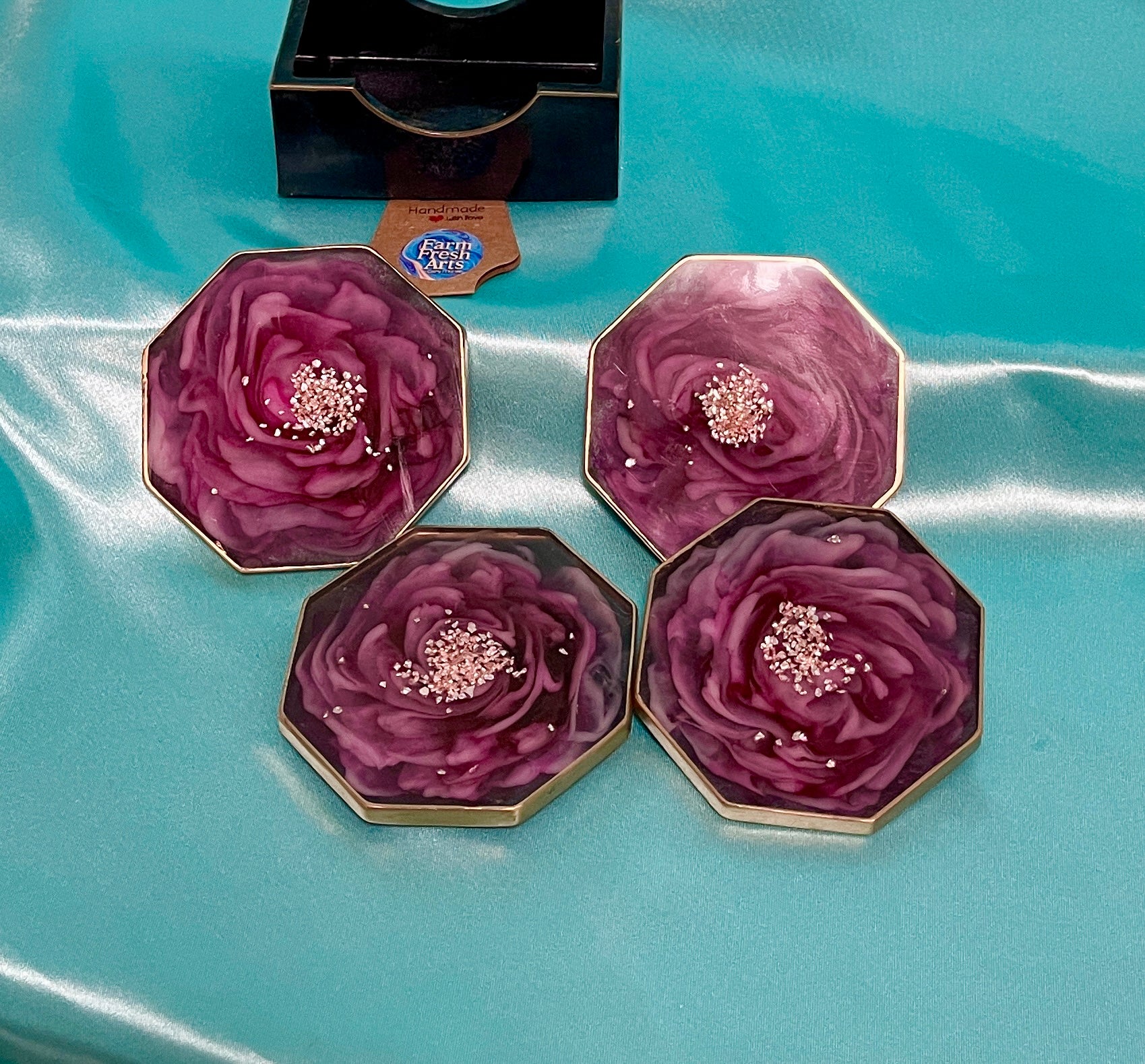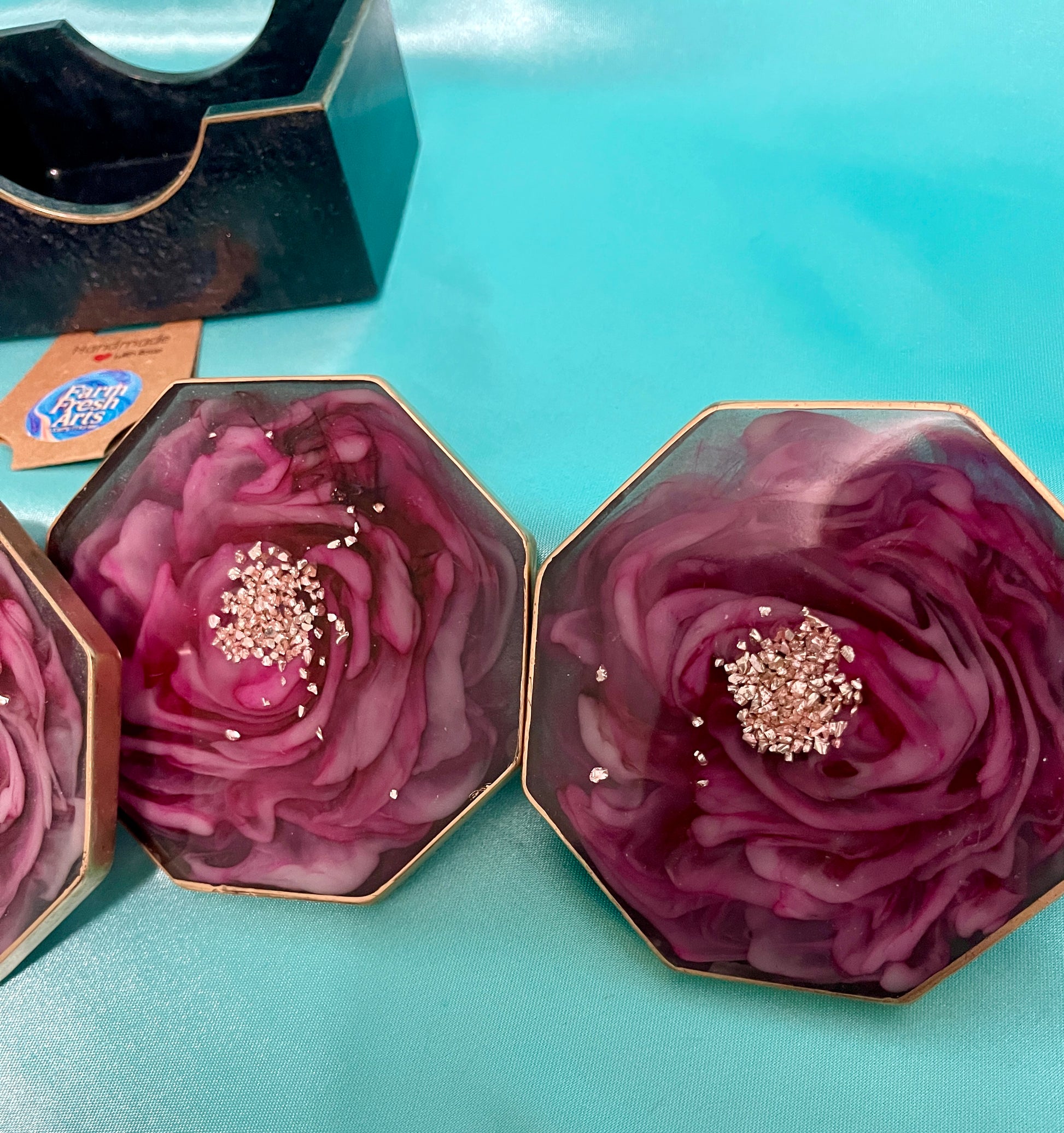 This is a set of 4 coasters and their holder. These are one of a kind resin coaster set. I only created 1 set of these. The coasters are an octagon shape measuring 3 1/2 X 3 1/2 inches across. Each coaster face has a 3D flower created with in the resin in light pink almost a hint of violet, and magenta flower with the center of light pink glass chips. The back of the coaster is black creating the back ground for the beautiful flower. The outside edges have been finished in a copper color. The rectangle holder is in matching black as the back of the coasters trimmed in the same copper color.